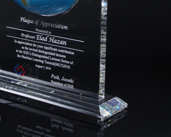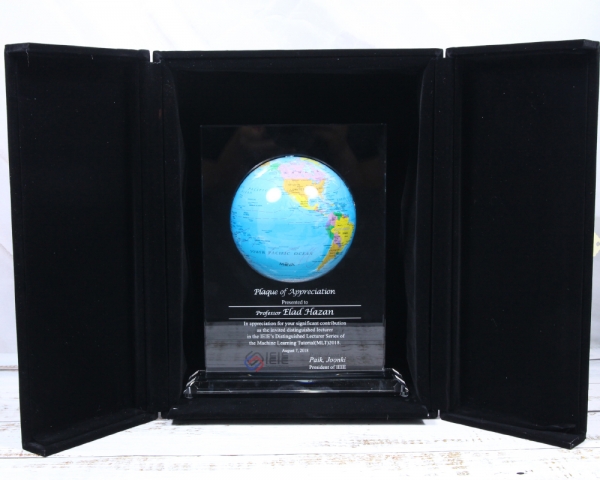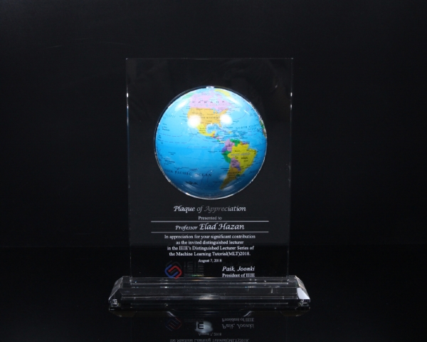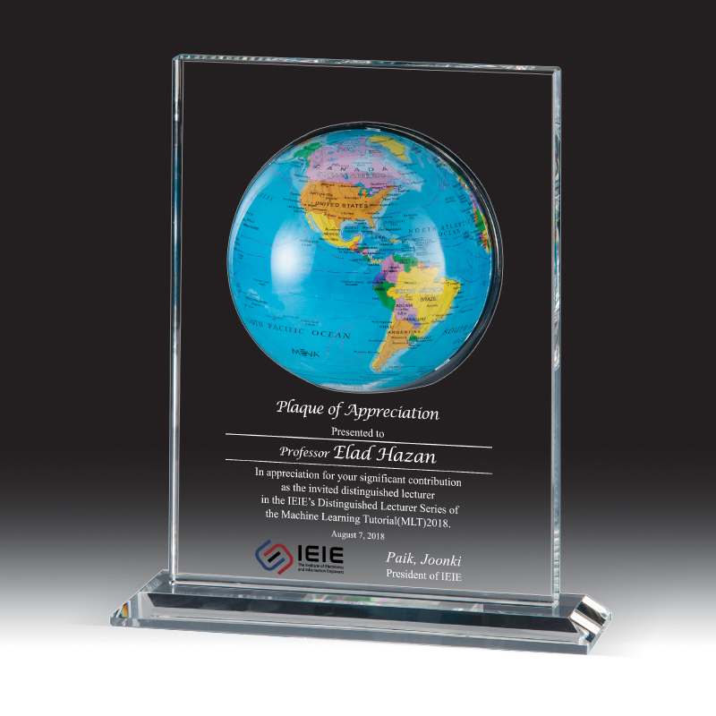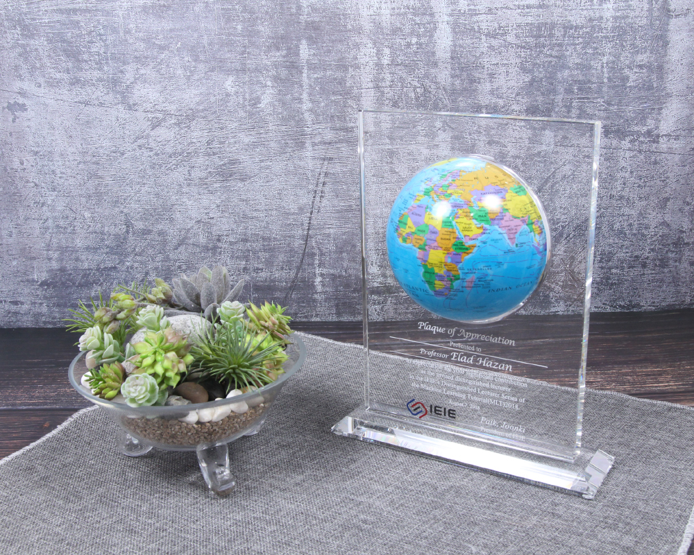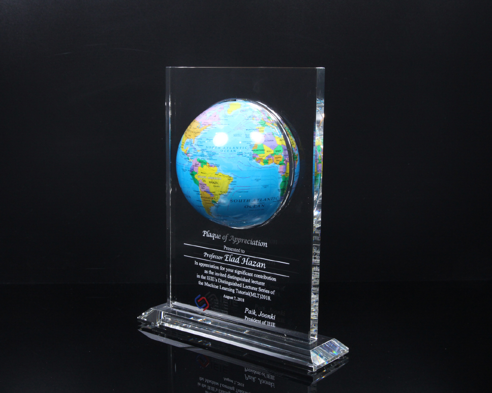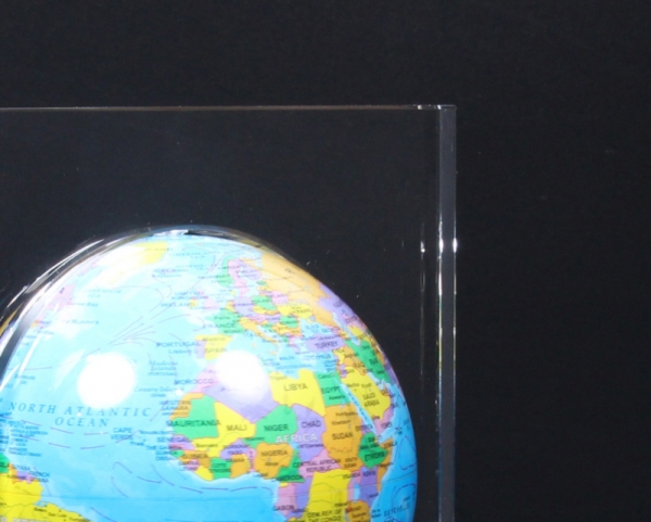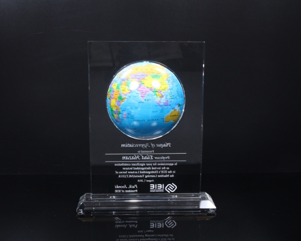 상패에 부착된 "모바글로브"는 빛과 자기장으로 회전하는 무동력 지구본입니다.